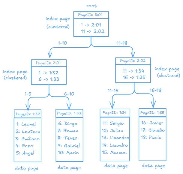 If, using these tables, a query were executed to retrieve the data of players whose IDs are between 1 and 5, only the leftmost branch of the tree would be traversed, avoiding a full scan of the table. Let’s see this in practice below.
