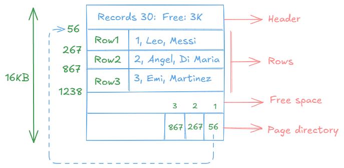 Data Storage in MySQL/InnoDB: Data is stored in structures called "pages," each typically 16KB in size. These pages contain rows of data, and when one is filled, a new page is created. Pages are grouped into "extents," and extents into "segments."